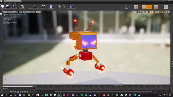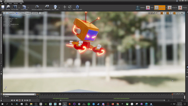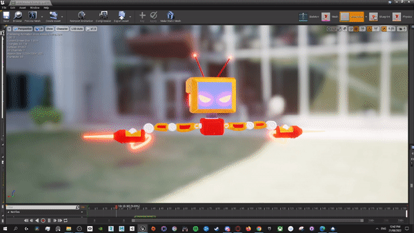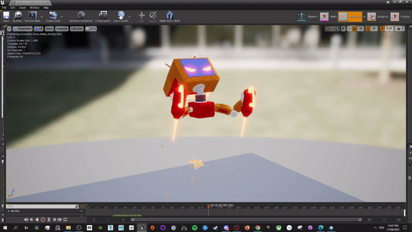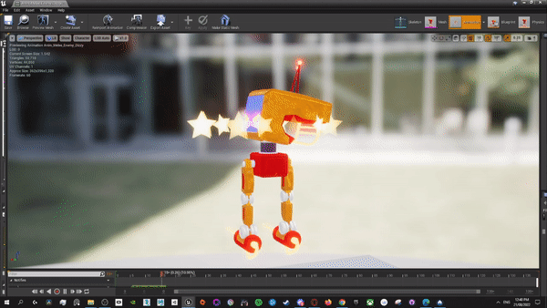 The process of importing our animations into the engine was quite easy, especially after we had to learn the hard way with the Reebo model. After switching the animations to the new skeleton and some rework on the root bone in Maya, we started adding all animations to the newly built state machine. We realized that some of the animation errors (playing incorrectly) that we had before were caused by the fact that the range of some of the anims was all over the place. Therefore what we did was set a new time range for each animation, where the end of it would be the beginning of another animation, so that the transition would be seamless. For example, the attack and the dizzy animations are connected by the same pose at some point, as follow what we had to do was find that pose and set it as the end for one and begin for the other. This made the transition from attack to dizzy very nicely and the player can't even notice that are two different animations.